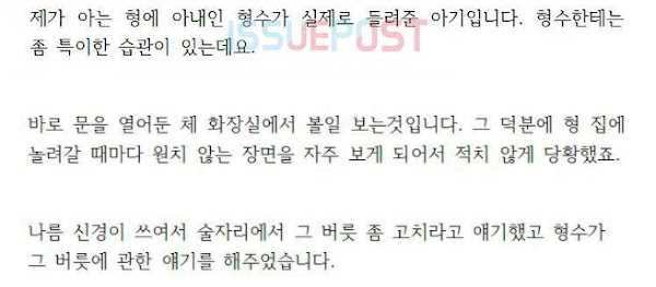 화장실 문 열고 볼 일 보는 형수..충격적인 이유