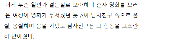 공포영화 보면서 무서워하는 옆자리 여자 손 잡아준 남친